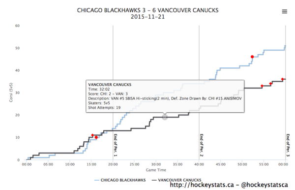 The Blackhawks closed the gap though, knotting things at three on a fire-drill goal off the stick of Artem Anisimov in the slot. The play was facilitated by one in a series of neutral zone misfires from the stick of one, Luca Sbisa, but I digress; nobody looked particularly good on that play.