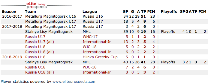 Sturdy two-way center with the reach of a giant octopus and a high compete level that makes him a difficult player to prepare for. Spiridonov is a natural center who began the season flanked by fellow 2019 draft prospects Dmitry Sheshin and Pavel Dorofeyv, and the trio clicked to the tune of two to three combined points per game. Both Dorofeyev and Spiridonov were ultimately promoted to Mettalurg for a trial by fire, simply because they proved to be to good for the MHL. Spiridonov, however, was the line’s driving force, using his size, reach and excellent anticipation to create havoc on the forecheck and during board battles. His straight-line speed is slightly above average and he has a short, wide stride, but he has shown to be able to pull away in open ice. His turns and pivots are sharp and he can move well laterally.Spiridonov’s active stick comes in handy during the penalty kill, not only for consistently keeping it in lanes, but also for picking off passes and transitioning to attack mode. He is a very good passer, but his assists come more from hard work in the corners or mucking and grinding near the net rather than set-ups of the fancy variety. He also can finish from just about anywhere, especially with his snapshot or wrister, and occasionally plays the role of a net-front presence thanks to his ability to tip home shots well away from his body. Spiridonov is dominant on faceoffs in any zone, and he can be entrusted to support his defenders either below the circles, in the crease or behind the net. He has a strong upper body and can lean or one-arm shove opponents off balance, but he does so in a clean, disciplined manner. — Steve Kournianos