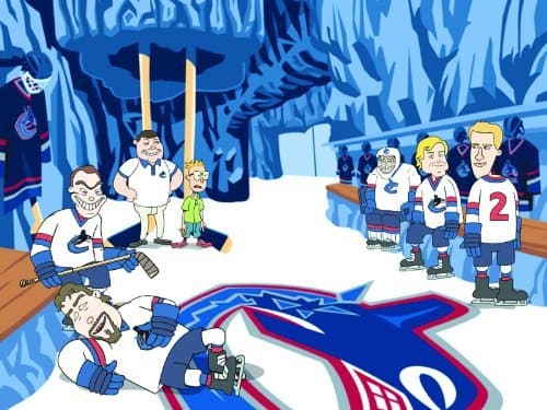 The above image obviously taken from Vancouver’s cavernous Bond-villain style dressing room (things were really bad in the player comfort department before Mike Gillis took over) is from Being Ian, a Canadian animated series that aired on YTV in the mid-aughts. If I’m not mistaken, the above screen shot features the cartoon likenesses of Matthias Ohlund (the blonde bombshell wearing number two), Markus Naslund (the blonde with the square chin beside Ohlund), Dan Cloutier (the old style mask is a dead give away), Jarkko "Frida Kahlo" Ruutu, and probably Todd Bertuzzi sleeping on the ground…