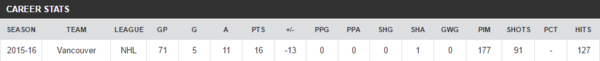 Originally brought in to “rub shoulders” with their younger players, Dorsett had plenty of opportunities to do that this year. The Canucks saw nine players make their NHL debut this year, and having Dorsett there to mentor and protect the young guns has its merits. Dorsett had 11 fights this season, and per www.HockeyFights.com voting, he won two of them. While there are many concerns over Dorsett’s contract, there is no doubting that he proved his value to management with his grit and character while chipping in with the bottom six.