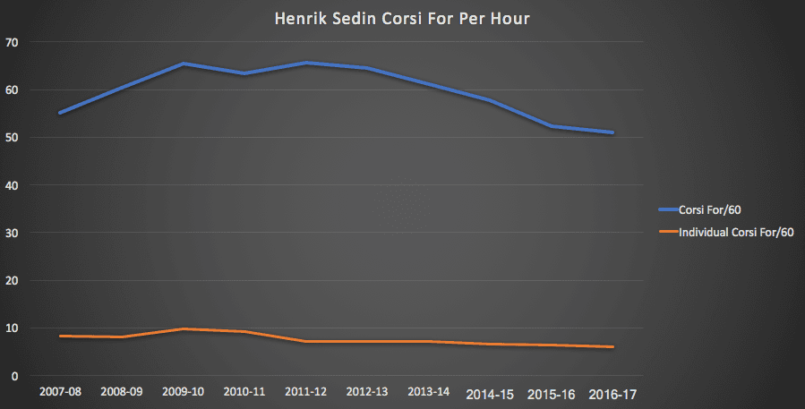 The numbers definitely back up the assertion that the Sedins’ decline is age-related. We know based on work done by Eric Tulsky that players generally reach their offensive peak around age 25, and their production really begins to drop precipitously after 30. Tulsky used points per sixty to illustrate this point, but given the volatility of shooting percentage and the multiple changes the Sedins have seen in teammate quality, this can sometimes be misleading. Shot rates, on the other hand, should be a bit less influenced by luck, so I decided to take a look at how many shots per hour the Sedins have been on the ice for since that data began being tracked in 2007. If we used Henrik as a proxy for his line, we can see that the Sedins’ ability to drive shot attempts has decreased to it’s lowest rate on record, down 10% from where they were in 2014-15.