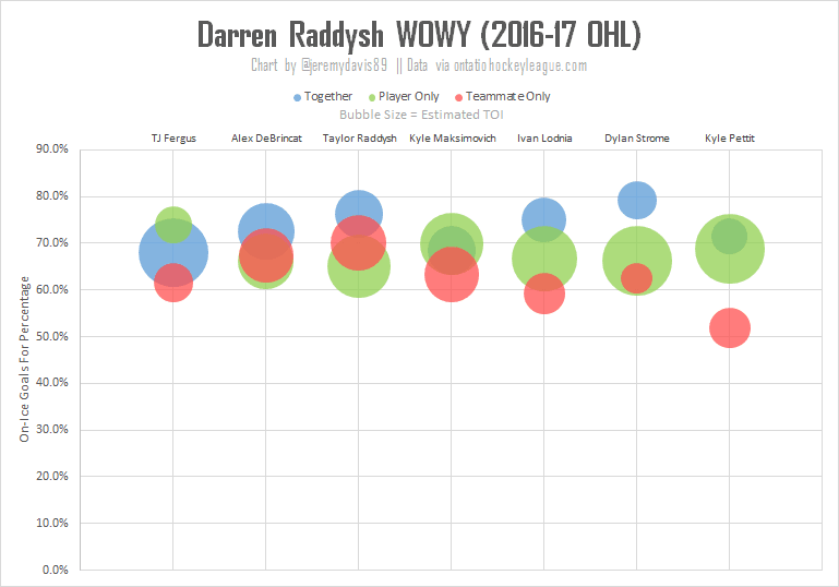 The statistics seem to match Otten’s eye test. I was able to put together a With-or-Without-You graph for Raddysh’s 2016-17 campaign, featuring his seven most frequent linemates:
