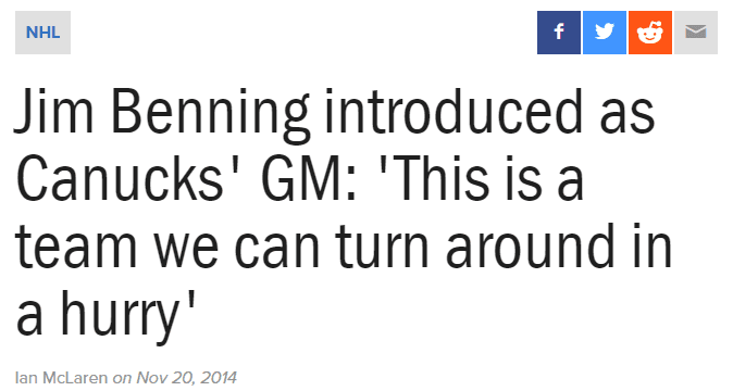 When Jim Benning was named General Manager prior to the 2014-15 season, his stated goal could not have been more clear: The Canucks were going to rebuild this roster on the fly, and remain competitive while developing youth. By every conceivable metric, they’ve failed to deliver on that vision.