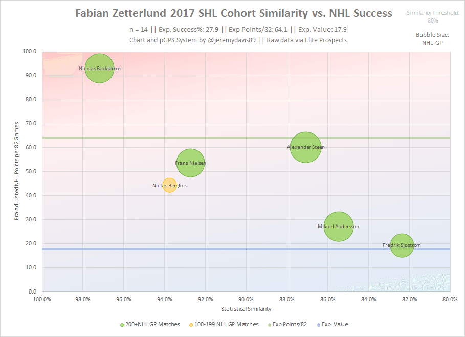 As is typically the case with European plays splitting their seasons, Zetterlund has a higher expected likelihood of success and higher expect value in the professional ranks of the SHL than the junior ranks of the SuperElit league, despite that fact that he scored zero points in the former and 36 points in the latter. This should come as no surprise, since playing professional hockey at 17 or 18 is a great sign of future success, and even a minimum amount of points can be a precursor to success.