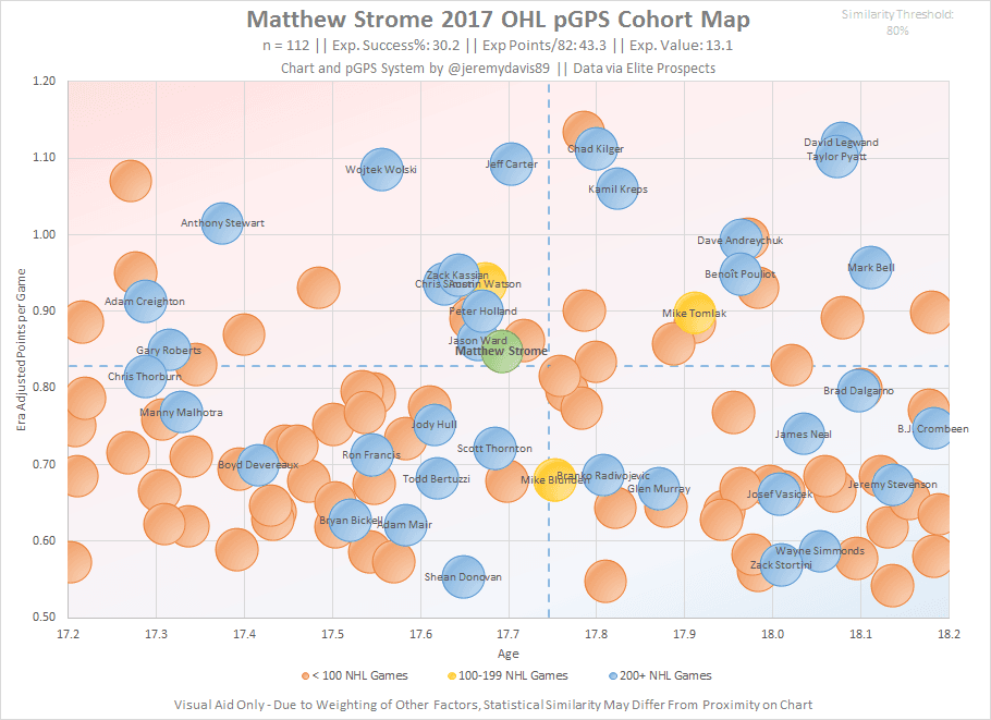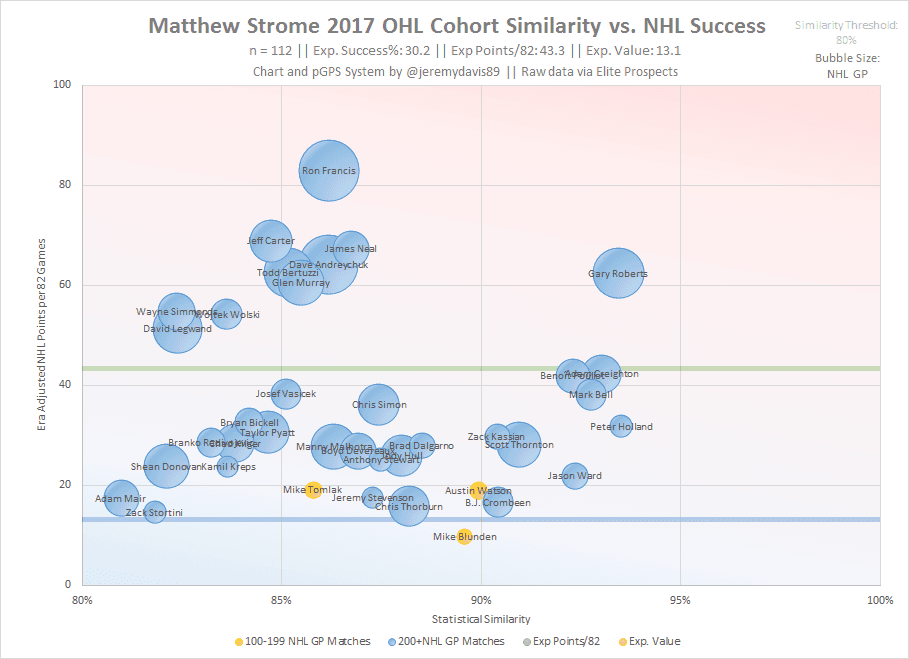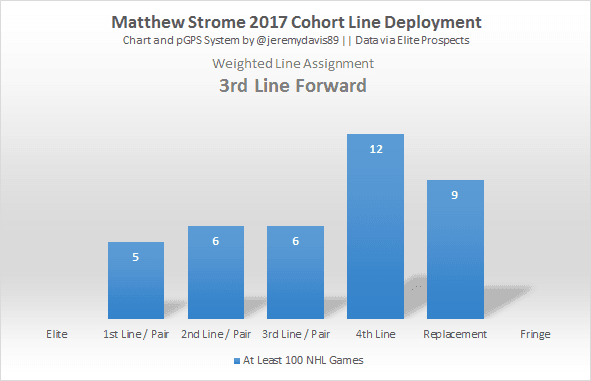 Strome wasn’t a high-end producer of offense this year, but watching him you get the sense that he absolutely would have been if he only could have got to his targets a little quicker. pGPS backs this up, as Strome carries an expected success percentage of 30.2%, with his most likely career assignment being a third-line winger. Like many players in his point range, however, the range of outcomes for Strome is very large, whose statistical cohorts include a few legitimate first-line players as well as a number of depth wingers.