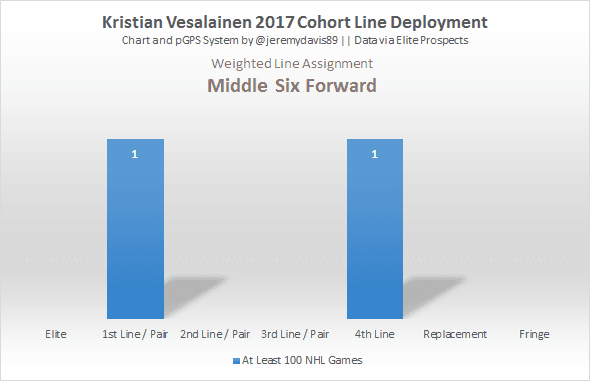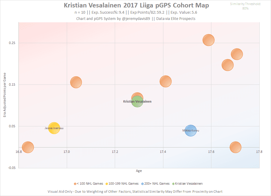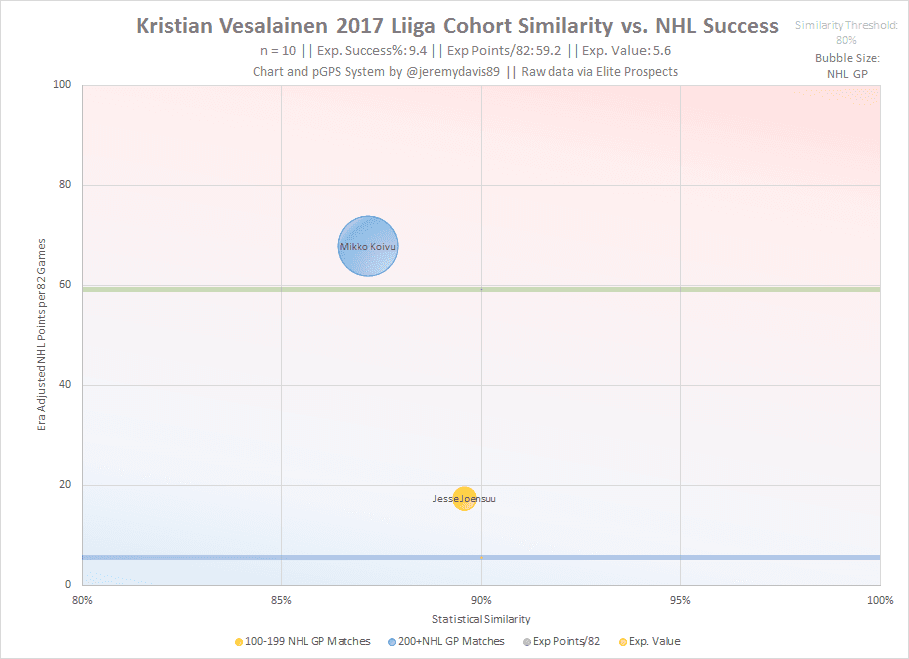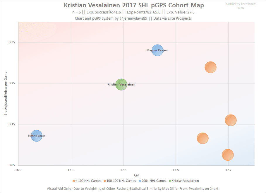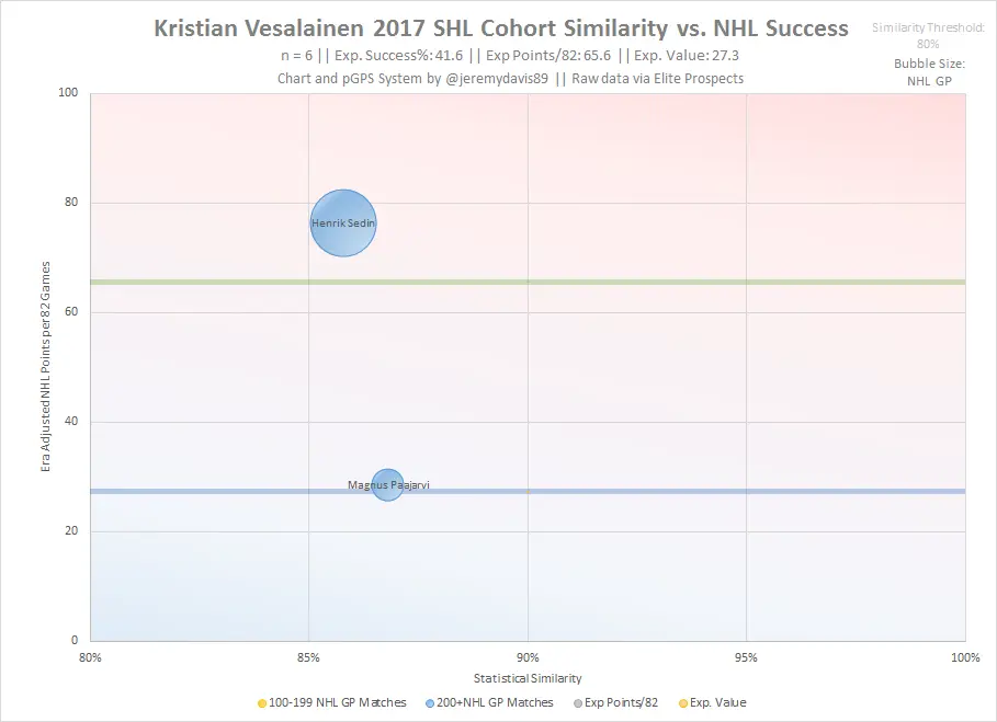 Because Vesalainen played more than a handful of games in a couple of leagues, I’ve included the results of both the SHL and Liiga cohorts here. His one point in nine games in the Finnish Liiga didn’t net him a particularly high likelihood of success (though his single match with 200+ NHL GP was the very successful Mikko Koivu), but his SHL cohort certainly did, despite a points per game of 0.23 that some have portrayed as lackluster or disappointing. Magnus Paajarvi and Henrik Sedin are included in Vesalainen’s Swedish cohort – although Henrik was in his draft-minus-one season at the time, they’re really only a few months apart in age relative to the start of the relevant seasons.