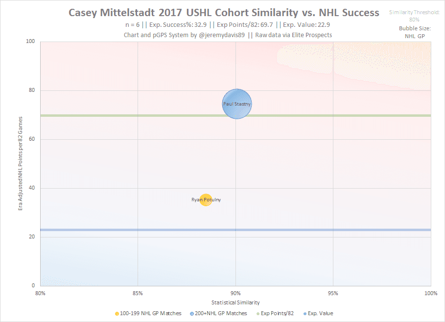 pGPS doesn’t shine the most favourable light on Mittelstadt, but I have to stress that his sample of USHL games is very small, as is his list of cohorts. Mittelstadt’s closest successful match is Paul Stastny, but it should be noted that Mittelstadt’s era-adjusted scoring rate slightly edges him out.