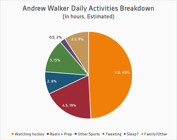 I’m sure many of you are curious as to just how much hockey that is each day, so I took the liberty of crunching the numbers. It’s what I do after all. I ended up passing the final values off to my esteemed colleague Ryan Biech yesterday (which he tweeted here), but if you want to get into the nitty-gritty of it, here’s how it all breaks down.