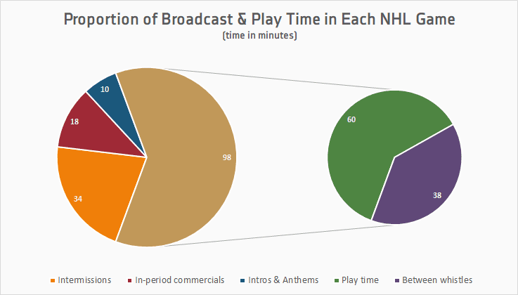 Next, we’ll lop off 17 minutes for each intermission, and then six minutes of commercial breaks for each period (that’s three two-minute breaks). That brings us to a palatable 98 of broadcast time per game. Easy enough.