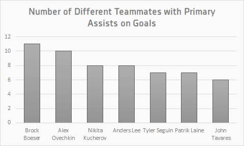 Looking at it from a different perspective, this chart shows how many different teammates have provided primary assists on the players’ goals this season.