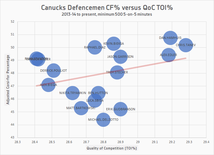 Chris Tanev and Alex Edler regularly take the brunt of the tough matchups, and although Del Zotto occasionally plays with Tanev, his quality of competition on average is much lower because he also plays on other pairings that get much easier matchups. You can see in the graph immediately above that Del Zotto’s QoC is markedly lower than the likes of Edler, Tanev, and Dan Hamhuis, and lower even than Gudbranson, Jason Garrison, Troy Stecher and Kevin Bieksa. He’s not getting buried while playing mostly against top forwards, he’s getting buried by everyone.