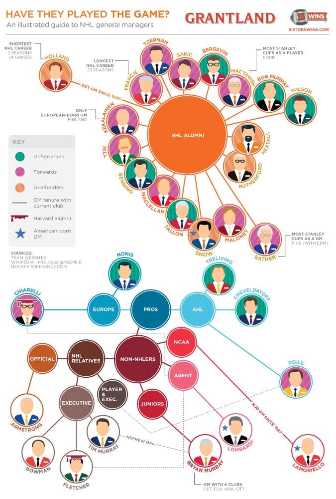 This research reminded me of an article by Sean McIndoe (a.k.a. DownGoesBrown) on Grantland a few years ago, and although the infographic below is now out of date, most of the overarching themes remain the system: the big bosses in hockey have deep roots in that sport.