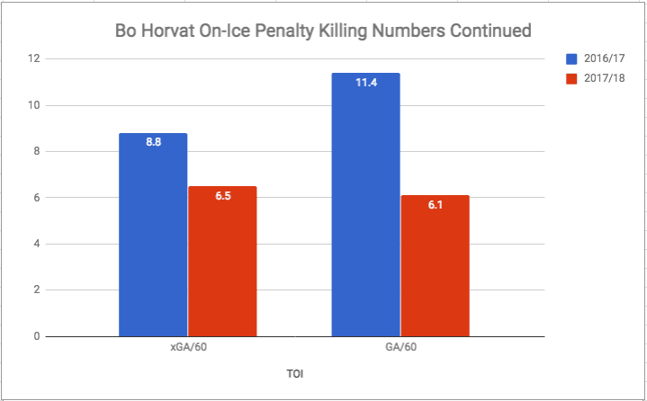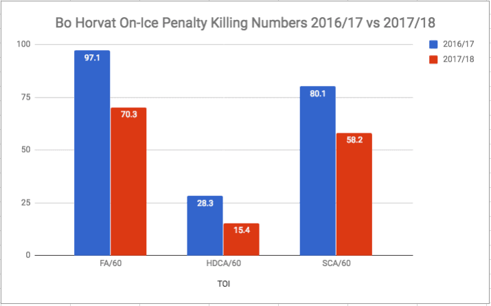 Where Horvat did take a step forward defensively was with his play shorthanded. As I outlined in an analysis piece at the start of this season, the Canucks hemorrhaged unblocked shot attempts, goals, and high danger scoring chances at a disproportionately high rate with Horvat deployed in 2016/17. Simply put, he was one of the worst penalty killers in the league that year.