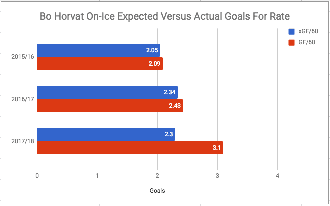 The most obvious sign of possible regression is the 10.2% five-on-five shooting clip with Horvat on the ice. That shooting percentage definitely comes into play when looking at his high on-ice goals for rate.