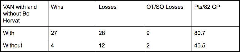 The team’s prodigious performance discrepancy makes sense from a logical standpoint when considering the structure that’s lost without Horvat in the lineup. The team relies on him to centre the first-line, play on the first power-play unit and kill penalties. When a player of that calibre goes down, it has a trickle-down effect on the rest of his teammates.