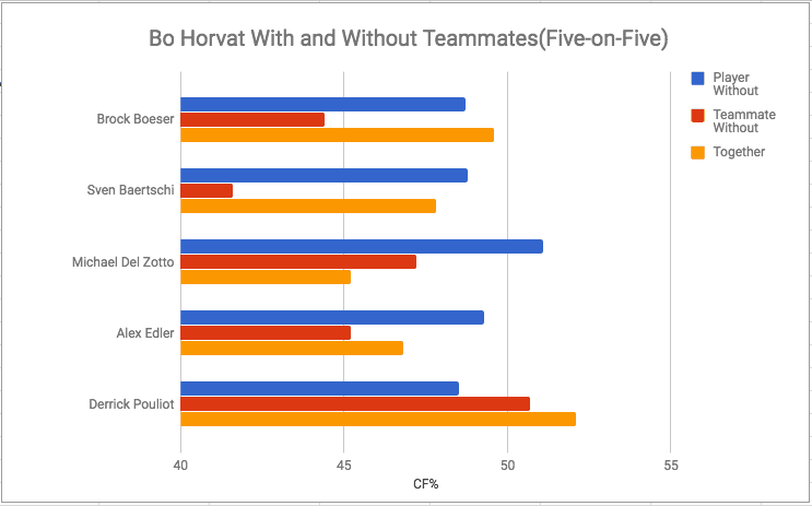 It’s fair to wonder how much linemate Brock Boeser may have skewed those results. The biggest flaw with Corsica’s expected goals model is that it cannot account for a player’s shooting ability– undoubtedly Boeser’s greatest asset.