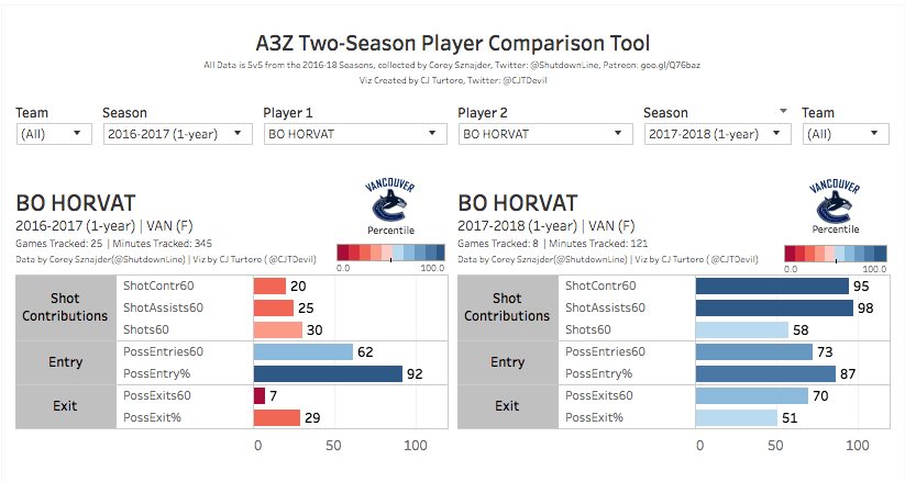 The pertinent category in this instance is shot assists per hour and while the sample size for this year’s data is small, it’s supported to an extent with the eye test. Horvat’s definitely put an emphasis on better leveraging his teammates, though I wouldn’t go as far as to say that Horvat’s an elite puck distributor like the sample might suggest.