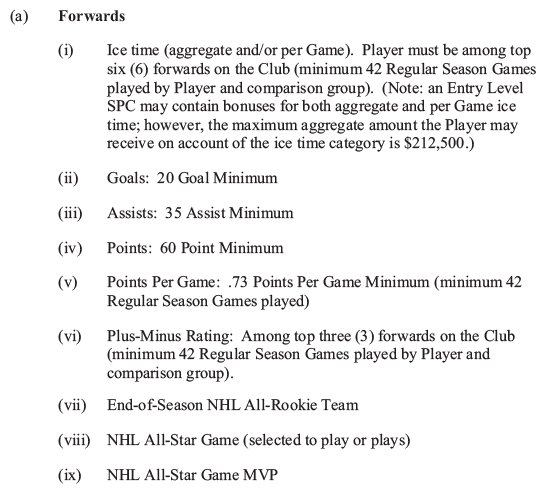 “A” bonuses are statistic-based bonuses that depend on the player either hitting certain threshold or finishing the season near the top of the team in certain categories. For forwards, they minimum thresholds look like this: