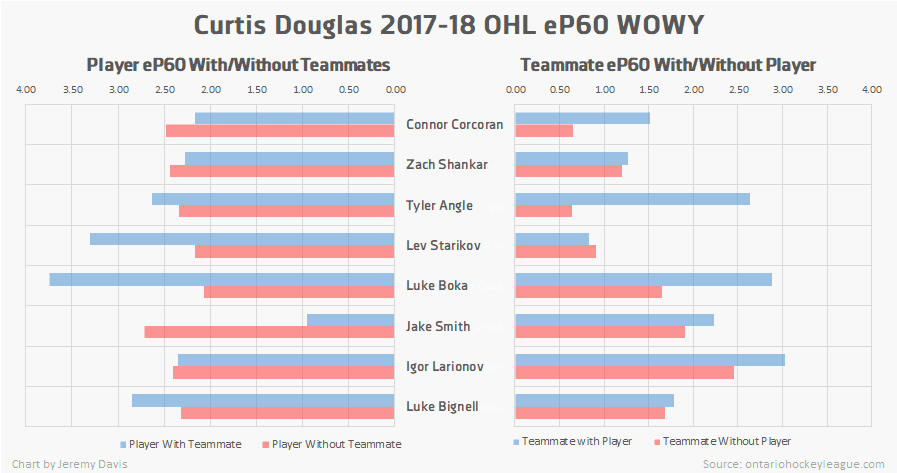 The WOWY charts below both indicate the Douglas’ linemates were better with him than without him, both in terms of point production and goal share. With a rebuilding team like Windsor, who have to wonder about who the linemates were playing with when they weren’t with Douglas, but it does indicate that he was having a positive effect.