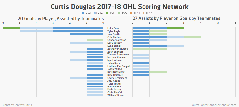 The main takeaway from this teammate plot (and the Scoring Network above) is that Douglas didn’t spend much time with consistent linemates. A mid-season trade certainly affects that, but Douglas still had rotating wingers whether he was with the Colts or the Spitfires, and in both cases he was looking at second or third line ice time. All of that conspires to make the production he did achieve that much more impressive.