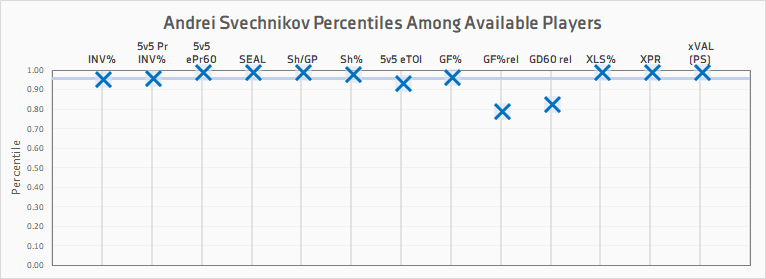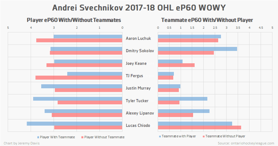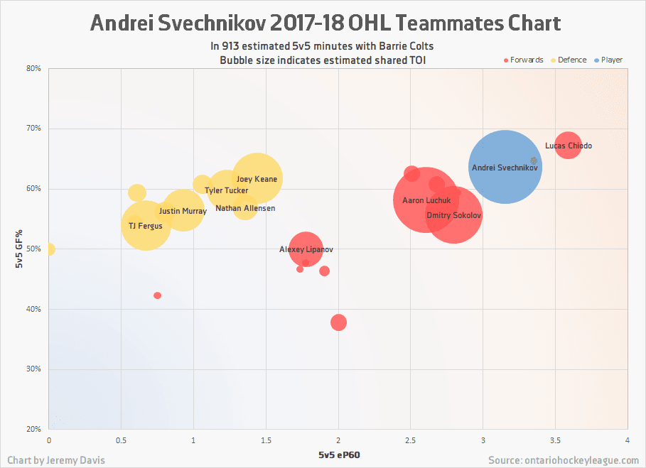 When we use the SEAL (Situation Era Age League) adjustments developed by CanucksArmy’s Jeremy Davis, we can see just how prolific Svechnikov’s production was in its proper context. Those adjustments bump his points per game rate up to 1.79, which is the second-best rate among first-time draft eligible players in this year’s class — behind, of course, Dahlin.