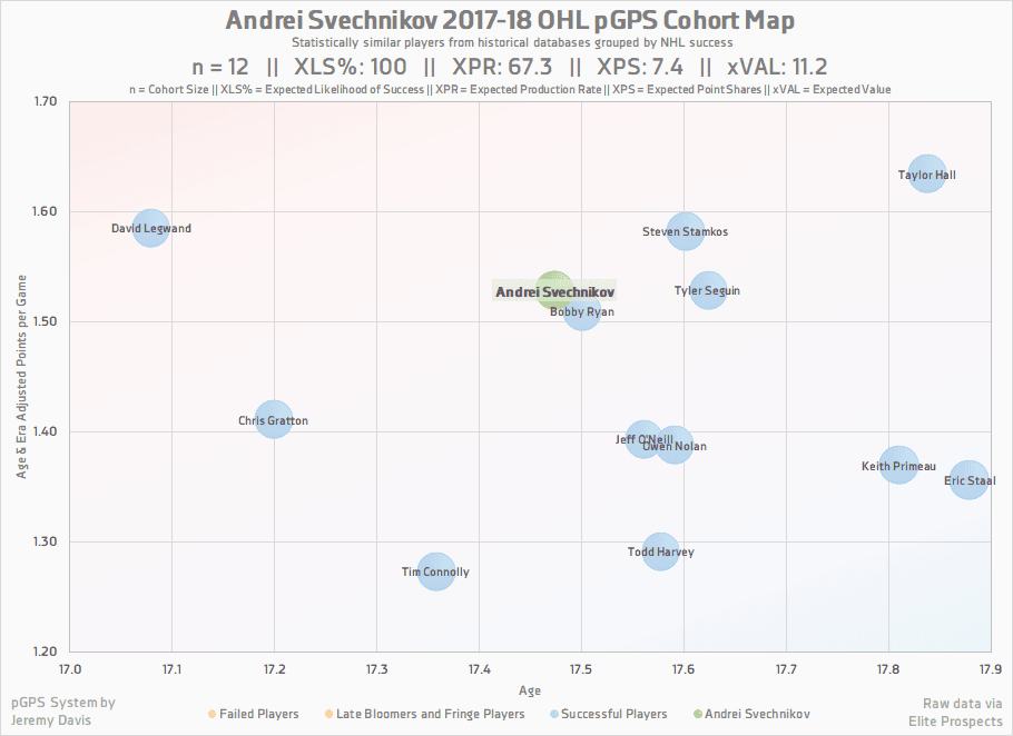 Some of his closest comparable players by the pGPS (prospect Graduation Probabilities System) are Bobby Ryan, Steven Stamkos and Tyler Seguin — good company to keep, across the board.