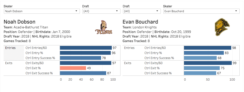 As the entry numbers can attest, both players were also effective on the rush. When they weren’t carrying the puck into the zone themselves, they were often joining it as second or third options. Dobson might hold an edge in this area because of his separation gear, but Bouchard was no slouch in picking up speed to catch up to the play either. Furthermore, Bouchard has superior instincts when driving to the net — always aware of which lane to take to be most effective.