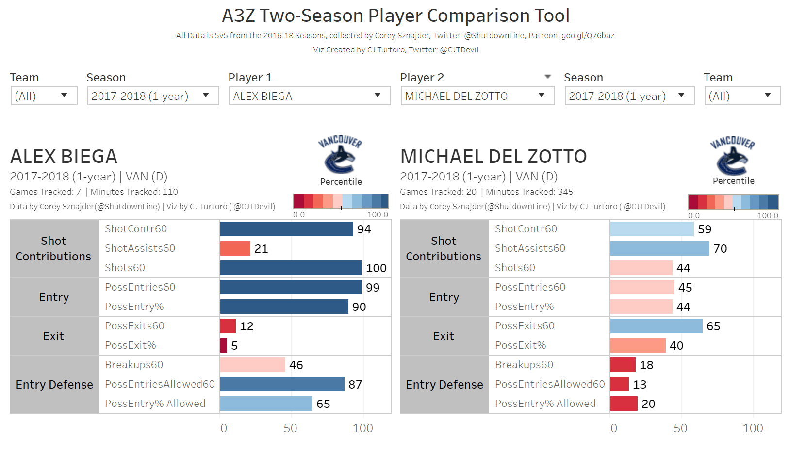 Alex Biega, along with Troy Stecher, was the team’s best player at generating controlled entries by both rate and percentage, but was among the league’s worst at generating controlled exits. Del Zotto’s numbers were middling, although he did generate a decent amount of controlled exits per 60. In terms of shot contributions, Del Zotto produced a fair amount of shot assists, but a low number of shots in contrast to Biega, who produced an obscenely high level shots but few shot assists.