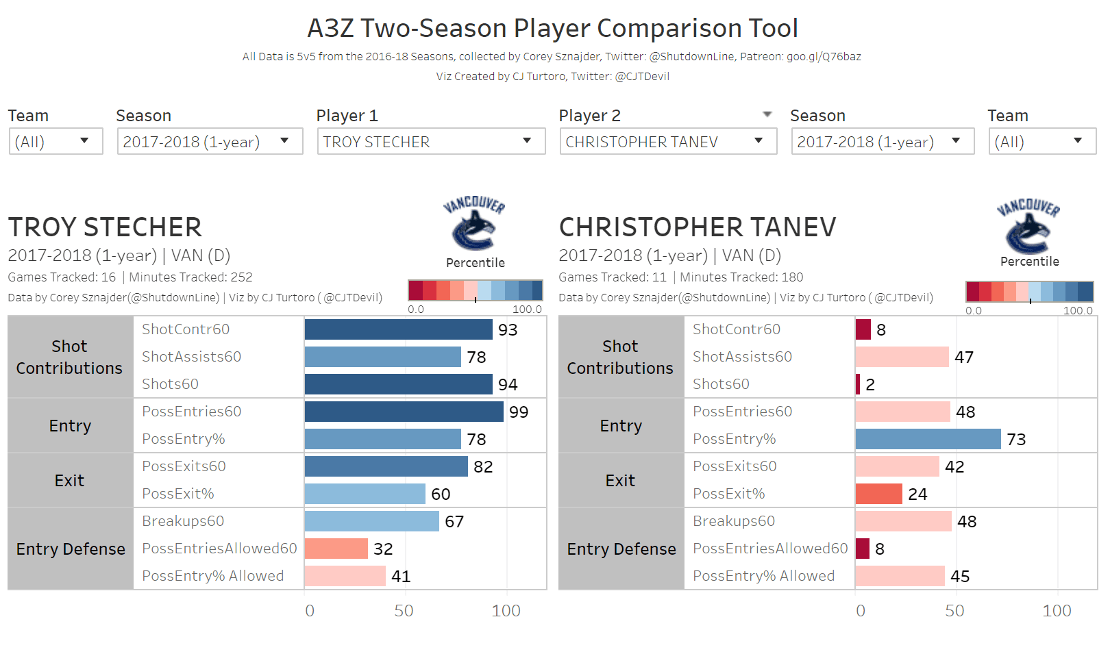 Chris Tanev had previously been one of the league’s more adept defenders at exiting the zone with control, but his numbers took a dip last season in every area other than his controlled entry percentage. This was likely due to changes in the Canucks’ system under Travis Green, as well as his struggles with injury.