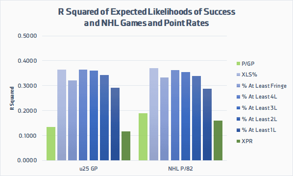 We see an even larger jump up in correlation and r-squared when using XLS%, pGPS’s Expected Likelihood of Success. However, other input measures like XPR (an average of successful matches’ NHL point production weighted by similarity) and xPS (the same as XPR but using NHL point shares instead of point production, and again weighted by similarity) are less effective at predicting games played and production rates than are weighted proportions of successful matches.