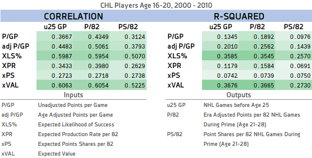 For the following table, I ran the pGPS formulas on CHL players from 2000 to 2010, then measured the correlations between a series of input variables (those available to junior prospects now, listed and defined below) against a series of output variables (those available after a player has played out all or most of his career in the NHL, also listed and defined below).