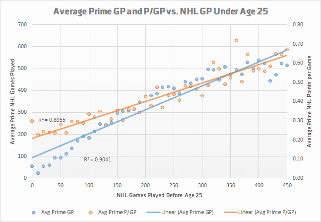 Figure 1 shows how the number of NHL games played by age 25 is related to the number of games played during prime years and the point rates achieved during prime years. Both show very high correlations, which makes logical sense. The more games a player plays while under team control, the more productive the player is likely to be in his prime.