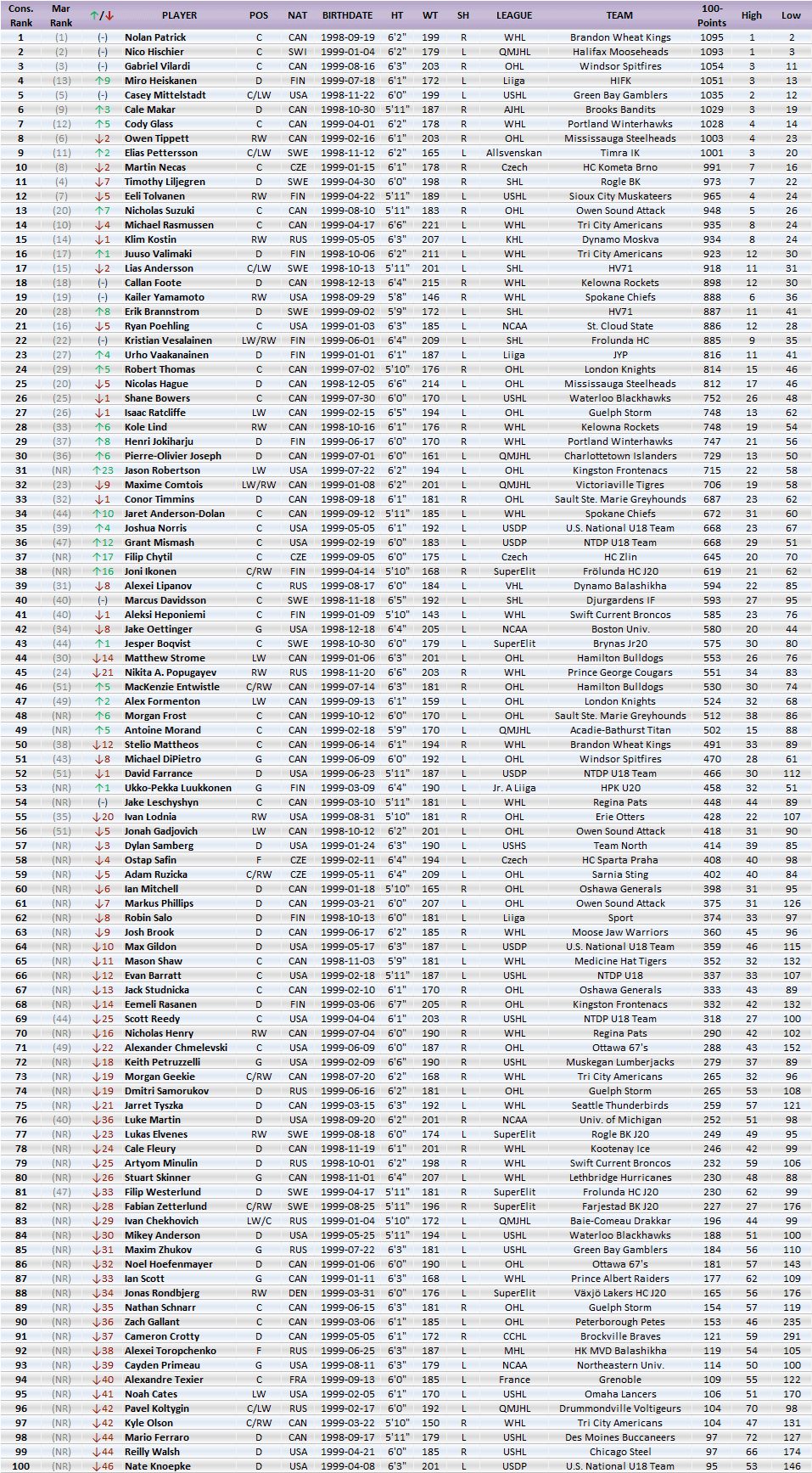 Player | Bob McKenzie | THN | Corey Pronman | Craig Button | Steve Kourianos | Dobber Prospects | Hockey Prospect | ISS | McKeen’s | Future Considerations | Jeff Marek |