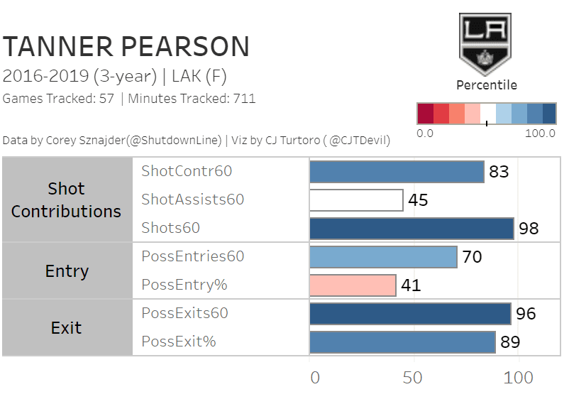 Since entering the league, Pearson’s been a solid middle-six contributor, usually as complementary piece on what was at one time a dominant second line for the LA Kings with Jeff Carter and Tyler Toffoli. While it should be pretty obvious that Pearson wasn’t the one driving the bus on that line, he held his own just fine, putting up 36+ points in three straight seasons while also boasting an impressive profile in terms of the underlying shot-based metrics.