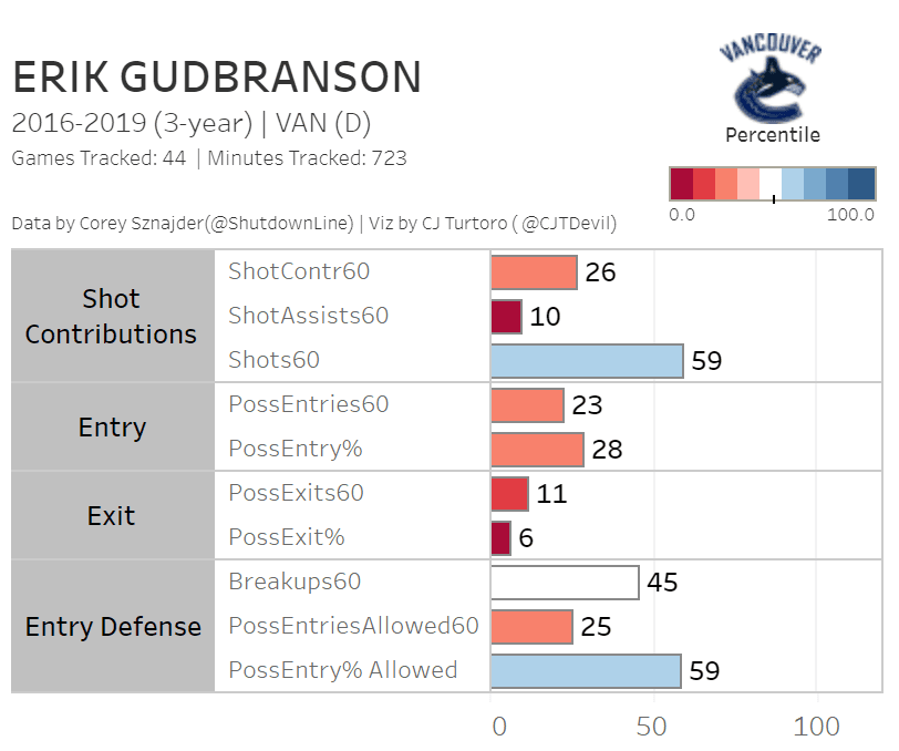 There’s just no nice way to say it. By just about every analytical tool available, Erik Gudbranson was one of, if not the worst defenseman in the National Hockey League. You’d have a tough time finding a defender who was more keen to take the glass-and-out approach, and it cost his team in the long run. This season, Gudbranson ranks in the bottom-ten among defenders with at least 300 minutes played in even-strength shot-share, shots conceded per hour, and goal-differential. Setting aside all the fancy stuff, over the course of Gudbranson’s time in Vancouver, no regular defenseman in the league carried a worse even-strength on-ice goals-for percentage than he did. There’s a lot of talk about all the things that analytics or statistics can’t measure, but how much your team scores versus how much they get scored on when you’re on the ice would seem to be the ballgame for me. For the better part of three seasons, the Canucks couldn’t generate offense or keep the puck out of the net when he was on the ice.