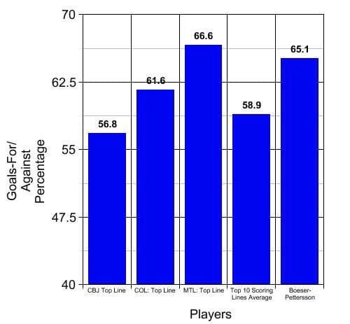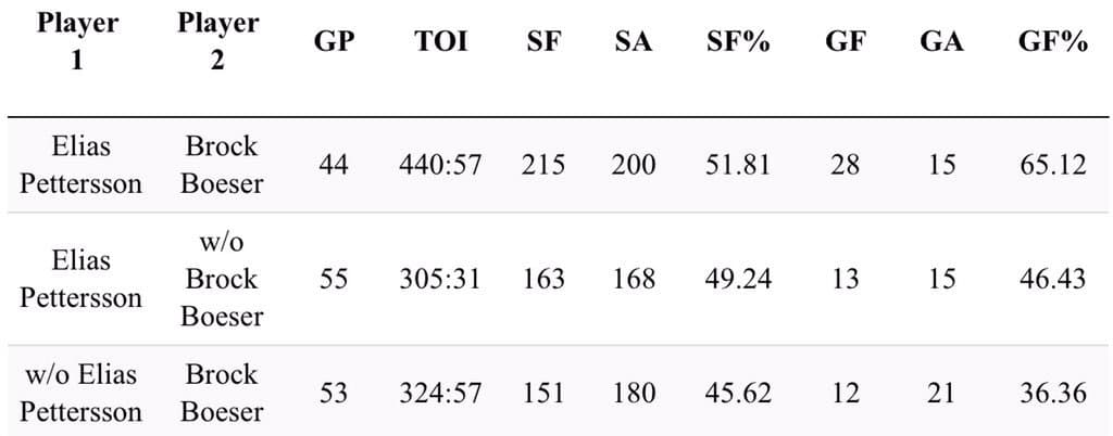 That pairing of Pettersson and Boeser have a Goals For percentage of 65.1%, that ranks higher than the average of the top 10 scoring lines in the NHL, which though has scored an average of 33.9 goals at five on five, has also put up a GF% of only 58.9%.