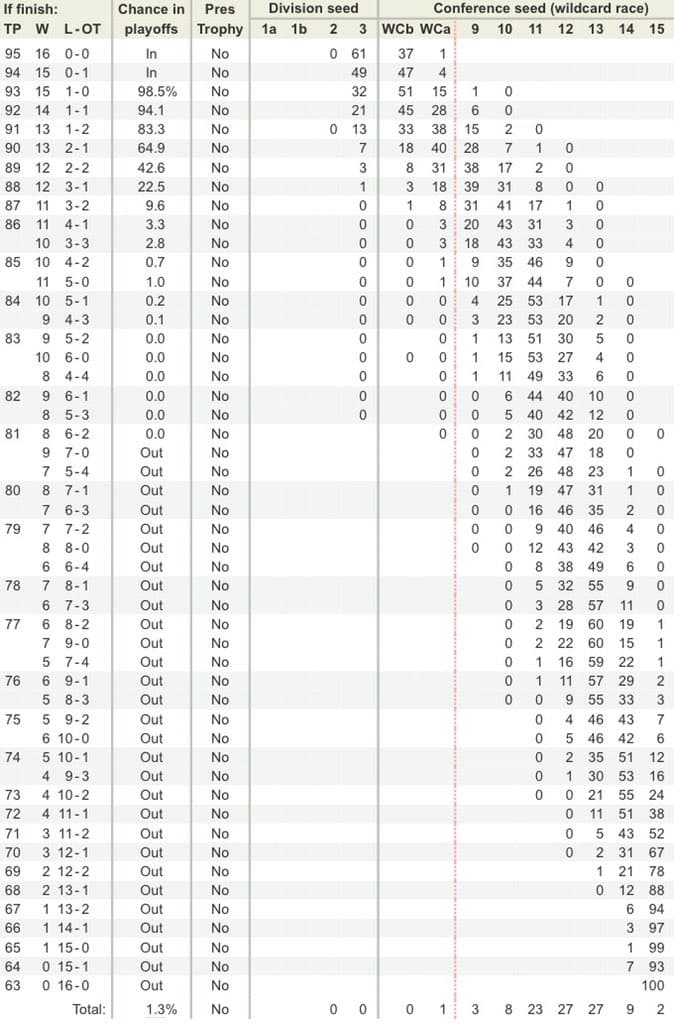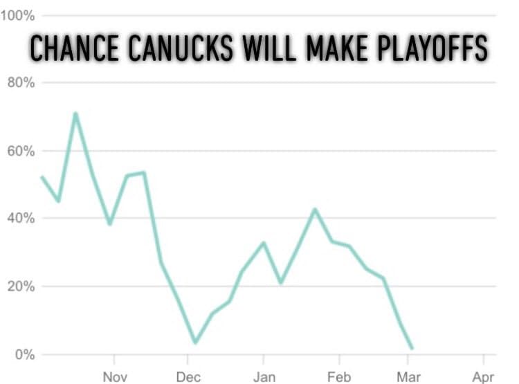 The playoffs have been slipping out of the Canucks’ grasp over the past 14 games, where they have put up a 3-8-3 record. According to SCS, this team would only have a 42.5% chance of making the playoffs if they were to finish the season with a 12-2-2 record and spoiler alert, that’s not going to happen.