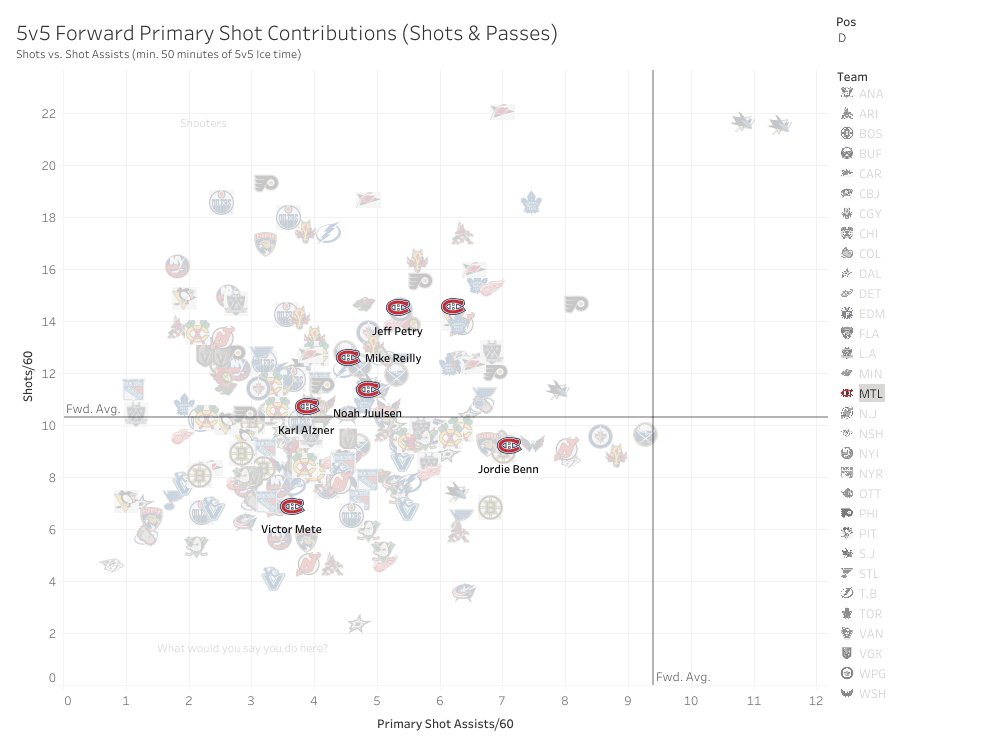 On the Habs, Benn had the highest rate of primary shot assists among defencemen. And significantly in the upper tier of defencemen across the entire league. While this could just be a result of Benn hardly shooting the puck when he has it on his stick in the offensive zone, he was still able to contribute more shot attempts than teammate Victor Mete.