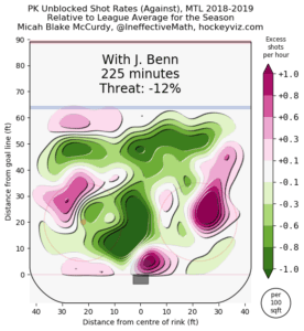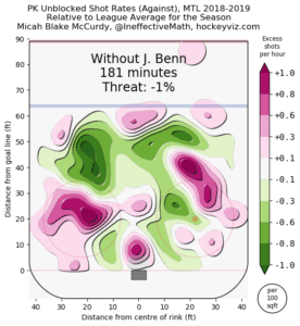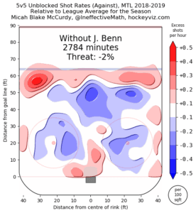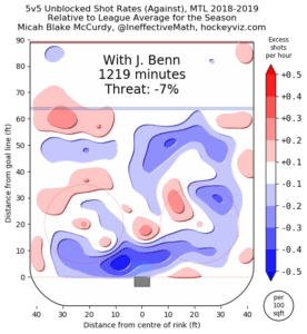 Using Micah Blake McCurdy’s shot rate viz, it’s easy to see what a difference Montreal was with and without Benn. While he was playing, the Canadiens suppressed shots to seven per cent lower than league average — especially around the net, where they hardly gave up any shots.