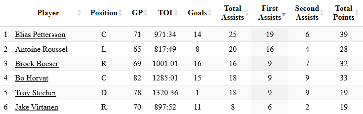 In fact, the stats would suggest that playmaking ability is his most valuable asset. Antoine Roussel was tied with Elias Pettersson for the highest rate of first assists per 60 minutes last season.