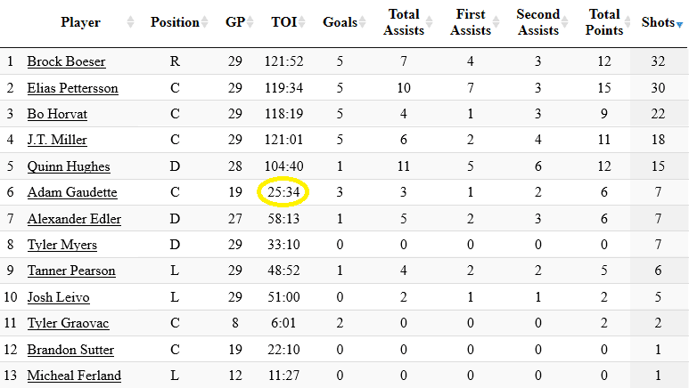 Jay Beagle and Brandon Sutter will be returning to the lineup sooner than later, but this time it might not result in Gaudette being sent to Utica. Gaudette’s success on the man advantage has taken the second unit from a wasteland to a genuine scoring threat, making him invaluable in the process. As the season goes on, I fully expect the team to continue to lean on him on the PP. Travis Green has made questionable decisions in the past, and will likely make questionable decisions in the future too, but this one seems like a slam dunk.