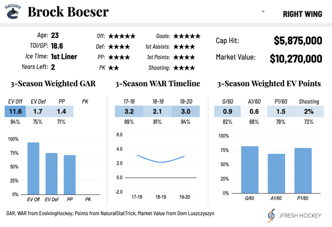 Below is a player card created by @JFresh hockey on Patreon showcasing Boeser’s well-rounded strengths offensively while also being underrated defensively.
