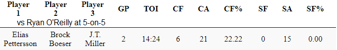 When I say The Lotto Line needs to be better I am only talking about 5-on-5. They have been excellent on the powerplay and are still putting up points every game. The thing that scares me is that against O’Reilly’s line, Pettersson and his wingers have not registered a shot on net in 14:24 of ice time.