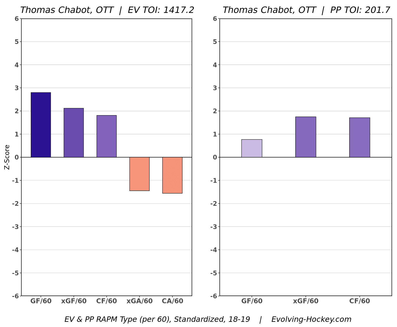 Looking at the advanced metrics, Chabot’s offensive impact was very impressive in 2018-19, even better than Hughes this past season. On top of that, Chabot was able to chip in on the power play, though not to the level of Hughes. However, Hughes does have the edge in the defensive end, which again is something we’ll have to keep an eye on throughout the upcoming season.