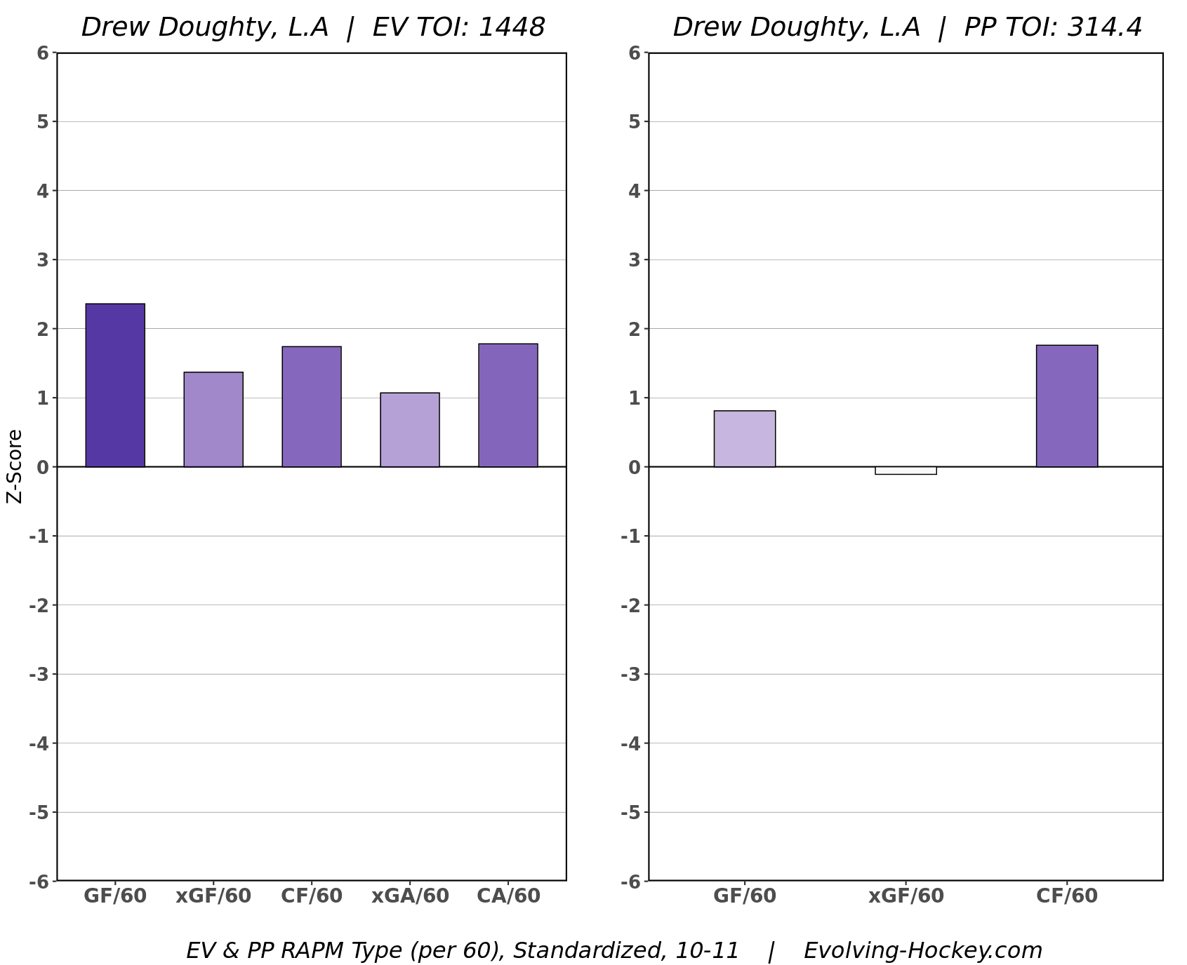 Doughty’s advanced stats were very impressive the year prior to signing his extension, with sizeable positive impacts both offensively and defensively at even strength. You can give the edge to Hughes on the power play, though Doughty was still good with the man advantage.