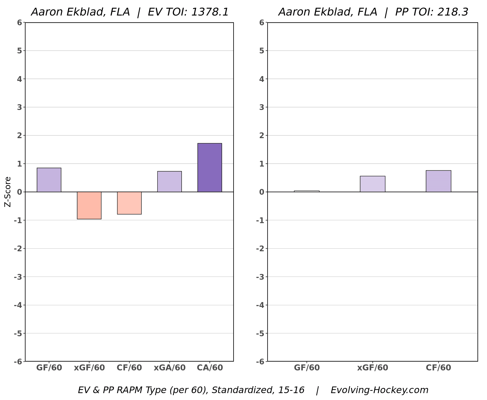 Ekblad’s advanced stats had room for improvement on the offensive side in 2015-16 before he signed his extension, with Hughes not only creating more chances but also converting more frequently. The edge goes to Ekblad in his own end though, where he was able to limit both high danger chances and general chances more effective than Hughes. Despite the differing numbers I really like this comparison as both are about equally important to their team, with Ekblad being a bit more well-rounded.