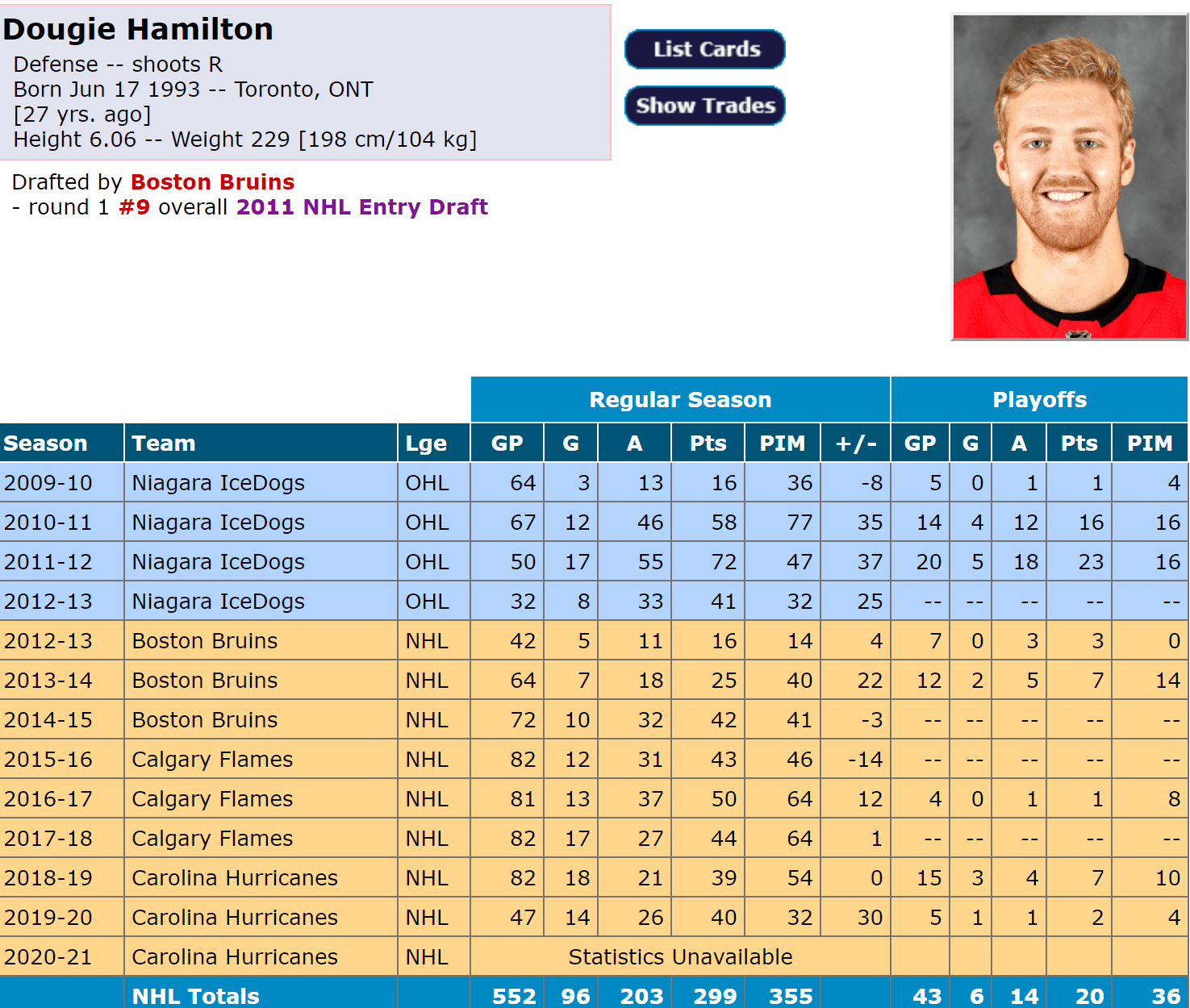Hamilton was drafted by the Bruins, but ended up being extended by the Flames after a trade to Calgary. Hamilton also didn’t play in the NHL until his draft plus 1.5 season, which gives him a bit of an edge development wise over Hughes.