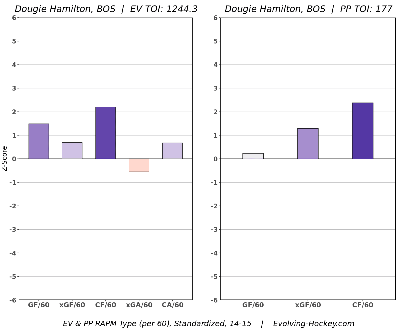 Hamilton’s advanced metrics in 2014-15 were actually very similar to Hughes’ this past season, though Hamilton was playing on a high-powered Bruins team. Hamilton may have actually had the edge over Hughes on the offensive side at even strength, though Hughes was better on the power play. Both had the same issue of giving up high danger chances but limiting general chances defensively.