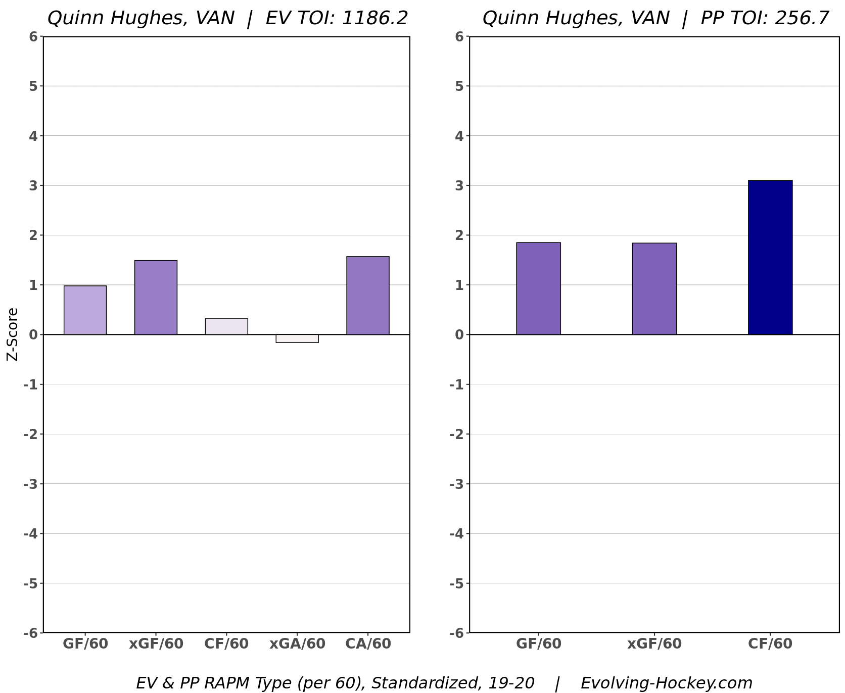 Hughes’ even-strength impact was impressive from a rookie, especially him being able to hold his own in the defensive end. His advanced metrics show that he was positive in almost every part of the game, though he did give up a fair amount of high danger chances. Hughes’ power-play impact was huge though, which is something the eye test could tell you as well.