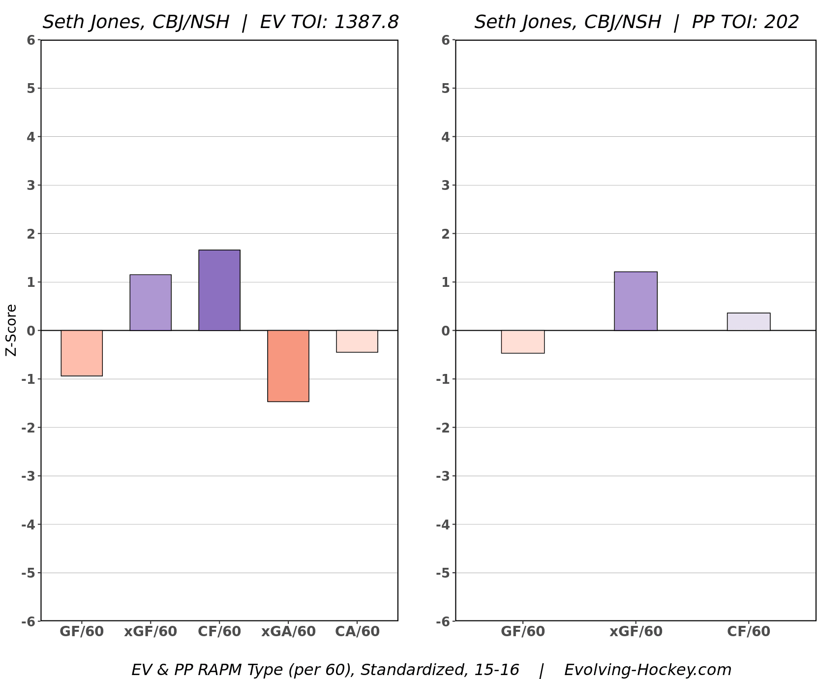 Jones split time between Nashville and Columbus in 2015-16, which may contribute to his sub-par advanced metrics the season prior to signing his contract. This probably isn’t the best comparison for Hughes, as Jones wasn’t really able to make the same impact as Hughes on their respective ELC’s.